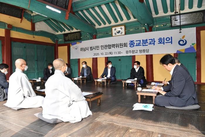 경기 하남시는 22일 광주향교 명륜당에서 범시민 민관협력위원회 종교분과 1차 회의를 열고 코로나19 방역수칙 준수에 관한 사항, 종교분과의 대응 및 실천방안 등에 대해 논의했다. 사진은 김상호 시장과 4대 종교지도자들이 한자리에 모여 대화를 나누고 있는 모습. (사진제공=하남시청)