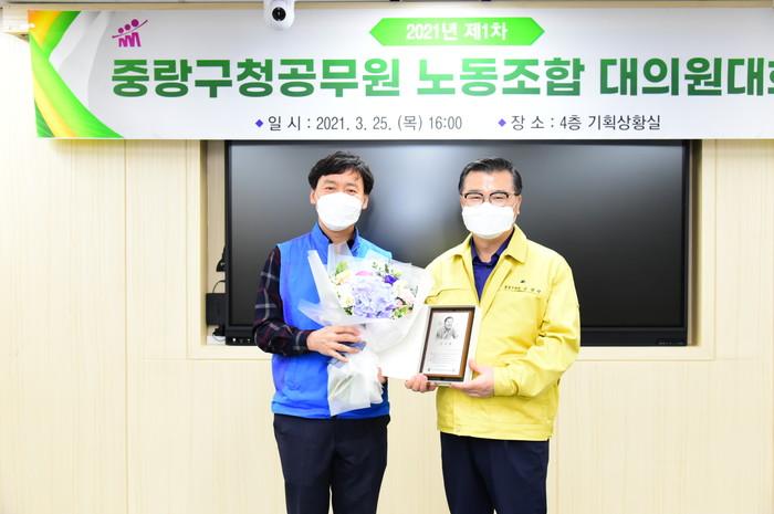 류경기 서울 중랑구청장이 25일 노사문화 정착과 소통·화합을 통한 조합원의 사기 진작에 앞장서고, 동주민센터 비상벨 설치 등 조합원 근로환경 개선에 기여한 공로로 전국시군구공무원노동조합연맹으로부터 감사패를 받았다. 사진은 류 구청장(오른쪽)이 감사패를 전달받고 기념촬영을 하는 모습. (사진제공=중랑구청)