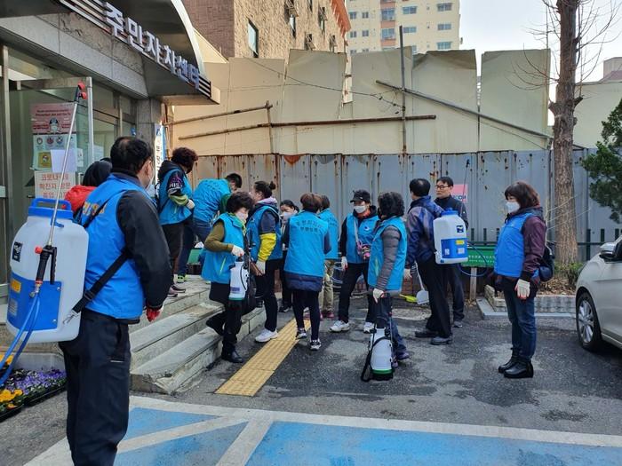 인천 부평구 부평5동은 코로나19 확산 방지를 위해 주민자치회를 비롯한 8개 자생단체와 함께 매일 8~20명씩 지역내 취약시설을 대상으로 방역 봉사를 하고 있다. 사진은 주민자치회 위원들과 자생단체 회원들이 방역작업을 준비하고 있는 모습. (사진제공=부평구청)
