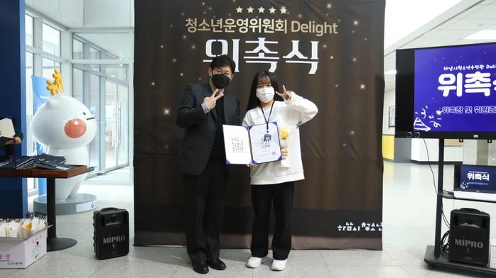 경기 하남시청소년수련관은 최근 청소년운영위원회 Delight 2기 위촉식을 열어 17명의 청소년운영위원에게 위원증을 수여하고, 이후 기관장 간담회인 ‘관장님 쇼!터뷰’를 진행했다. 사진은 위촉식에서 조재영 관장(왼쪽)이 위원증을 수여한 뒤 기념촬영을 하는 모습. (사진제공=하남시청)