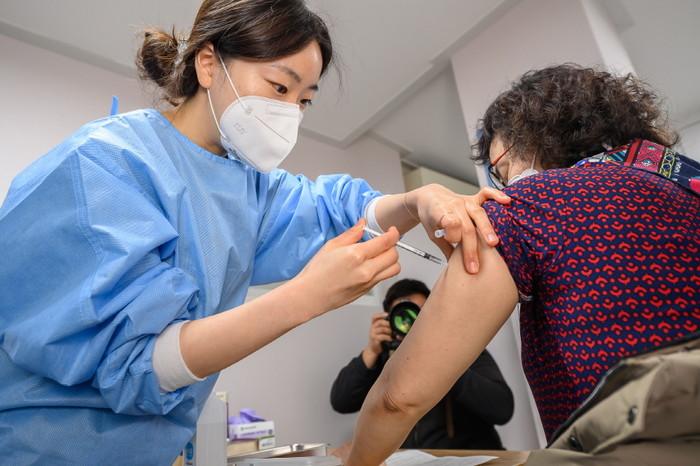 서울 양천구 보건소는 2일 코로나19 백신 접종을 시작했다. 보건소는 코로나19 백신 예방접종을 위해 자체접종하는 요양병원 3곳과 위탁체결을 완료했고, 자체접종이 어려운 19곳의 요양시설 등에는 방문 예방접종을 한다. 사진은 신목행복자리 어르신 요양센터에서 백신을 접종하는 모습. (사진제공=양천구청)