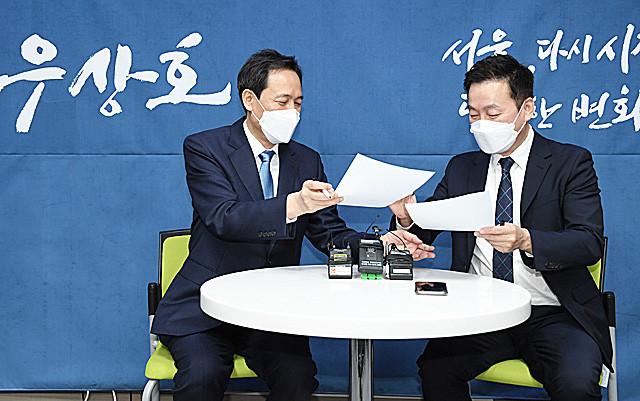 더불어민주당 우상호 서울시장 보궐선거 예비후보(왼쪽)와 열린민주당 정봉주 서울시장 보궐선거 예비후보가 7일 오전 국회 의원회관에서 만나 범여권 서울시장 후보 단일화 합의문을 교환하고 있다.