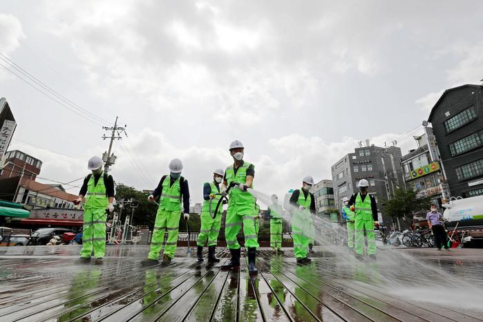 4일 오전 서울 성북구 삼선교 분수광장에서 성북구청 직원들이 신종 코로나바이러스 감염증(코로나19) 예방을 위한 물청소와 방역 작업을 하고 있다.