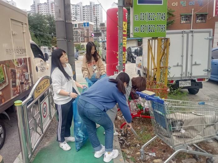 경기 의정부시 자금동은 최근 청소년 자원봉사자 40여명과 함께 지역내 청소취약지역을 대상으로 '청소년과 함께하는 자금동 클린데이'를 진행했다. 이날 학생들은 무단투기된 쓰레기 수거와 불법광고물 및 현수막을 정비했다. 사진은 쓰레기 수거 모습. (사진제공=의정부시청)