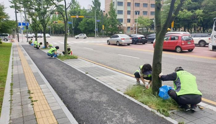 경기 수원시 장안구 정자3동은 최근 쾌적한 가로환경을 만들기 위해 장마철 대비 일제 대청소를 통해 공원 및 가로변에 방치돼 있는 쓰레기를 수거하고 잡초를 말끔히 제거했다. 사진은 이날 참여한 봉사자들이 가로변 잡초를 제거하고 있는 모습. (사진제공=수원시청)