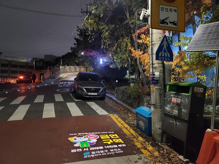 | ▲ 삼육초등학교 주변 통학로에 설치된 ‘고보조명’이 금연구역을 알리는 메시지를 비추고 있다. (사진제공=동대문구청) |