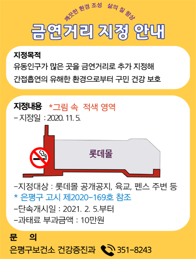 2018년 구파발역 일대 금연거리가 지정·운영됨에 따라 롯데몰 공개공지 및 그 주변에서 흡연하는 사례가 빈발해 피해를 호소하는 구민들의 의견을 수렴했고, 안전문제를 우려한 롯데몰 은평점의 요청으로 지정됐다.