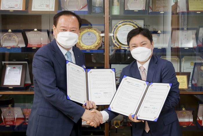 | ▲ 최근 구청에서 열린 친환경 업무용 카셰어링 사업 업무협약식에서 유동균 구청장(왼쪽)과 오현영 공동대표가 협약을 체결한 후 기념촬영을 하는 모습. (사진제공=마포구청) |