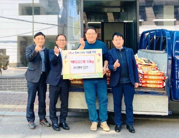 헬스케어제품을 판매하는 기업 (주)텐마인즈가 23일 코로나19로 인해 어려워진 지역내 저소득층을 지원하기 위해 서울 용산구 이태원2동, 남영동, 한남동 주민센터 3곳에 각각 백미(10kg) 100포씩을 기부했다. 사진은 백미 전달 후 관계자들이 기념촬영하는 모습. (사진제공=용산구청)