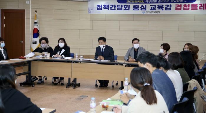 장석웅 전라남도교육감이 27일 나주시 소재 전라남도창의융합교육원에서 나주 지역 교직원·학부모 다모임, 나주학부모회 네트워크 회원들을 만나 현장의 목소리를 듣는 '경청올레'를 진행했다. 사진은 나주 학부모회 네트워크 경청올레에서 장석웅 교육감이 참석자들과 의견을 나누고 있는 모습. (사진제공=전남교육청)