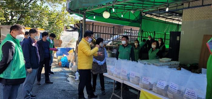 경기 구리시는 28일 교문1동 새마을지도자협의회와 ‘사랑이 담긴 소머리국 대접 행사’를 진행해 소머리국과 깍두기를 만들어 교문1동 저소득 홀몸노인 200명에게 마스크와 함께 전달했다. 사진은 이날 안승남 시장(가운데)이 봉사자들과 대화를 나누고 있는 모습. (사진제공=구리시청)