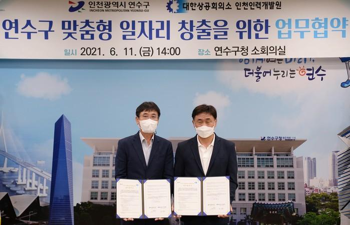 인천 연수구가 최근 구 맞춤형 일자리 창출을 위해 대한상공회의소 인천인력개발원과 업무협약을 체결했다. 이번 협약으로 양 기관은 연수구 맞춤형 일자리 창출위한 직업훈련교육 등에 앞장설 예정이다. 사진은 협약식에서 고남석 구청장(오른쪽)이 관계자와 기념촬영을 하는 모습. (사진제공=연수구청)