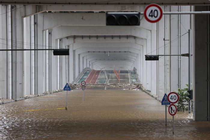 4일 오전 전날 내린 폭우로 한강 수위가 상승하며 서울 잠수교가 물에 잠겨있다.