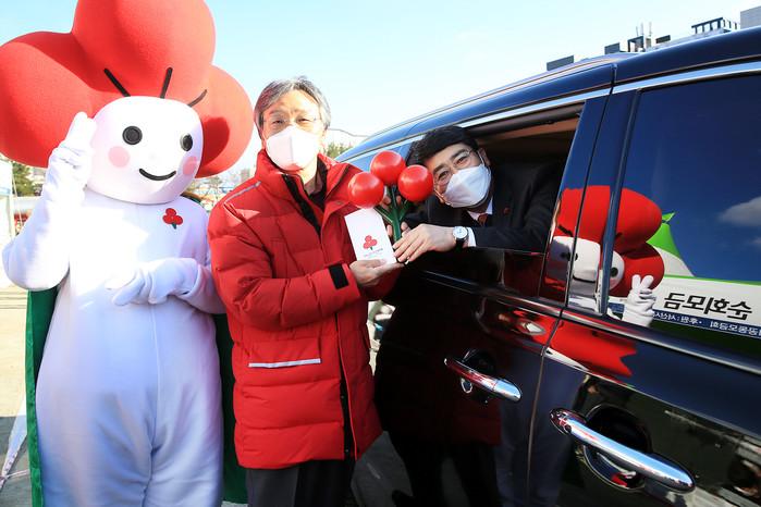 충남 서산시가 8일 중앙호수공원 공영주차장에서 '희망 2021 나눔 캠페인 집중 모금의 날'을 운영했다. 사진은 이날 참석한 맹정호 시장(오른쪽)이 드라이브 스루 방식으로 성우종 충남사회복지고동모금회장에게 성금을 기탁하고 있는 모습. (사진제공=서산시청)