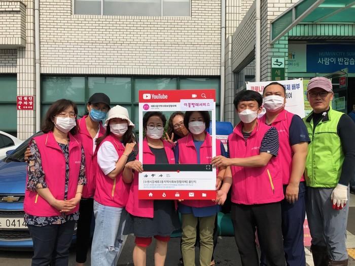 경기 수원시 권선구 세류3동 지역사회보장협의체가 16일 지역내 저소득 2가구에 이불세탁 서비스를 제공했다. 사진은 협의체 위원들이 이불세탁 서비스 제공 후 기념촬영을 하는 모습. (사진제공=권선구청)