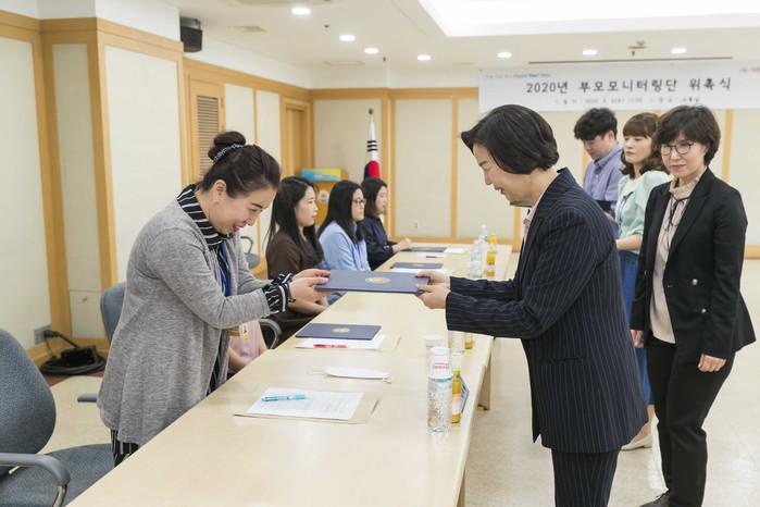 6일 김수영 서울 양천구청장이 구청 소통실에서 선정된 부모모니터링단원에게 위촉장을 수여했다. 위촉단은 영유아에 대한 건강, 급식, 위생, 안전관리 등을 모니터링하는 역할을 맡게 된다. 사진은 위촉장을 전달하고 있는 김 구청장(오른쪽)의 모습. (사진제공=양천구청)