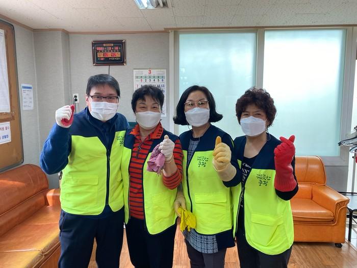 서울 중랑구 신내2동 주민으로 구성된 ‘신2나는 싹쓰리 주민봉사단’은 지난 19일 신내2동의 신내9단지 경로당을 방문해 청소와 소독 작업을 진행했다. 사진은 신2나는 싹쓰리 주민봉사단이 봉사활동 후 기념촬영 하고 있는 모습. (사진제공=중랑구청)