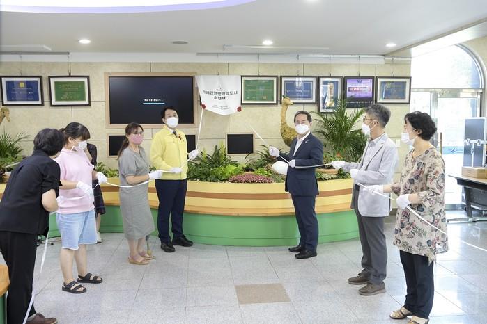 전남 순천시가 최근 교육부 주관 ‘2021년 장애인 평생학습도시’ 선정을 축하하며 현판식과 공감토크를 개최했다. 시는 이번 선정으로 장애인과 비장애인이 함께 평생학습 공동체 환경조성 등을 목표로 40여개 사업을 추진하고 있다. 사진은 허석 시장(가운데 오른쪽)이 관계자들과 현판식을 진행하고 있는 모습. (사진제공=순천시청)