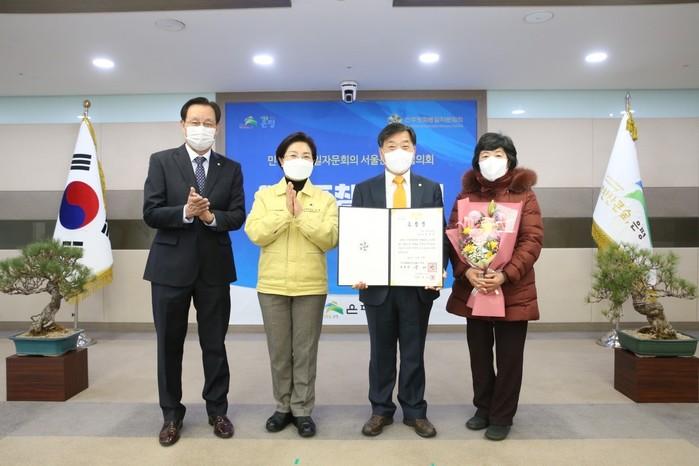 서울 은평구는 최근 민주평화통일자문회의 의장표창 수여식을 열고, 평화와 번영의 한반도를 만드는 데 기여한 원유흥 수석부회장과 유해영 부회장에게 의장표창을 수여했다. 사진은 수여식에서 김미경 구청장(왼쪽에서 두 번째)이 원 수석부회장에게 의장표장을 하고 기념촬영을 하는 모습. (사진제공=은평구청)
