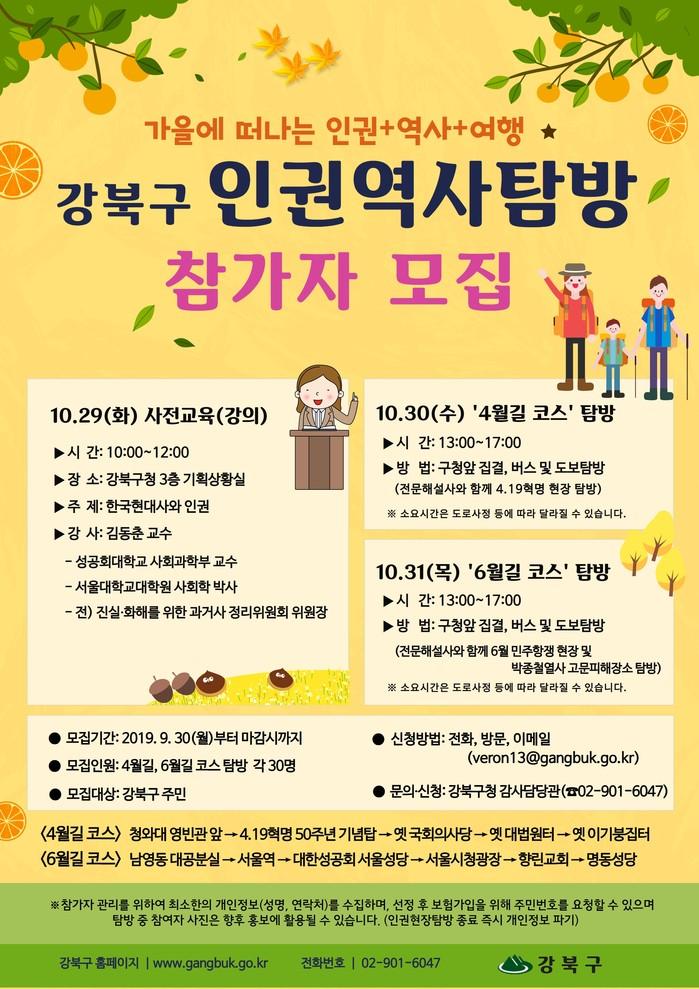 [시민일보 = 홍덕표 기자] 서울 강북구(구청장 박겸수)는 우리나라의 인권 성장과정을 알아보고 그 소중함을 인식하는 계기를 마련하고자 '강북구 인권역사탐방'을 운영한다고 10일 밝혔다.