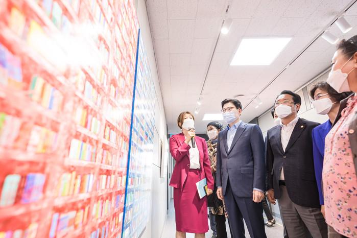 이정훈 강동구청장이 13일 구청 1층 로비에서 열린 ‘열린 미술관 개관식’과 구청 앞 열린뜰에서 열린 ‘토닥토닥 힐링 콘서트’에 참석했다. 사진은 이 구청장이 열린 미술관 개관식에 참석해 미술관 내부를 살펴보고 있는 모습. (사진제공=강동구청)