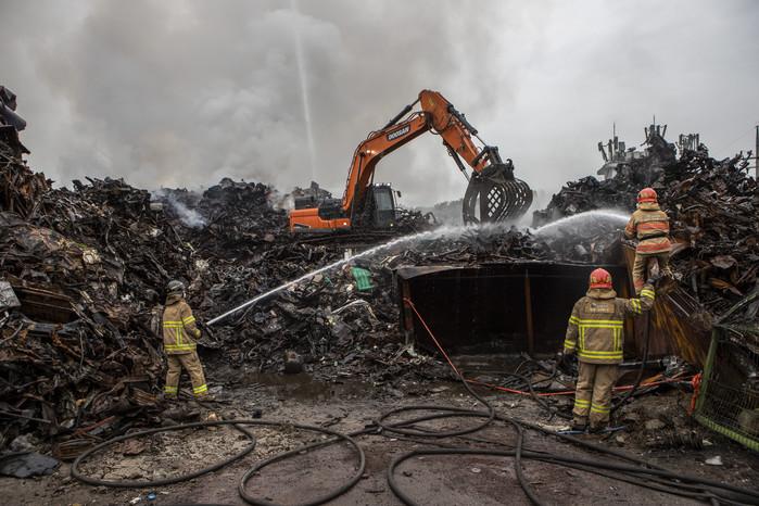 27일 경기도 고양시 덕이동의 한 폐차장에서 소방대원들이 진화작업을 벌이고 있다. 이곳에서 지난 25일 오전에 발생한 화재로 인명피해는 없었으나, 폐차가 쌓여 있어 소방대원들이 진화에 어려움을 겪고 있다.
