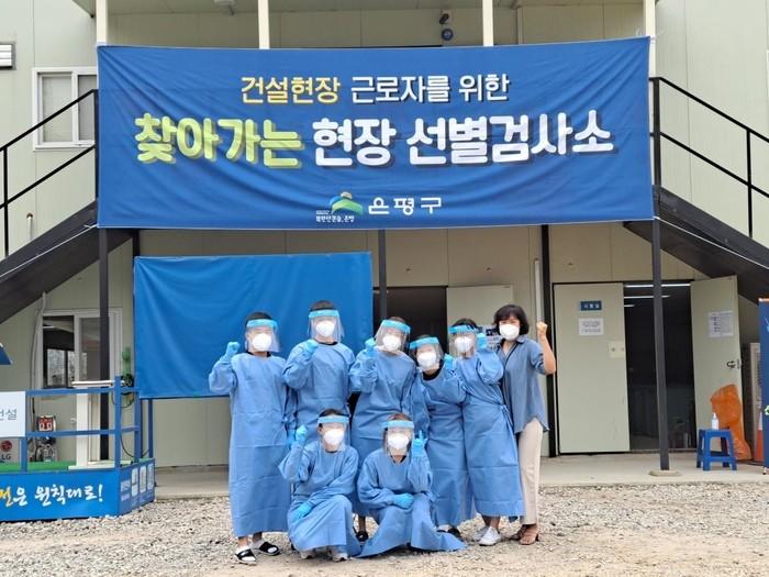 은평구가 지역내 건설현장에서의 집단감염을 방지하기 위해 현장 근로자들이 근로시간에 구애받지 않고 편하게 코로나19 검사를 받을 수 있도록 ‘찾아가는 현장 선별검사소’를 오는 31일까지 설치·운영한다. 사진은 최근 ‘찾아가는 현장 선별검사소’ 앞에서 코로나19 퇴치를 위해 다짐하는 의료진들의 모습. (사진제공=은평구청)