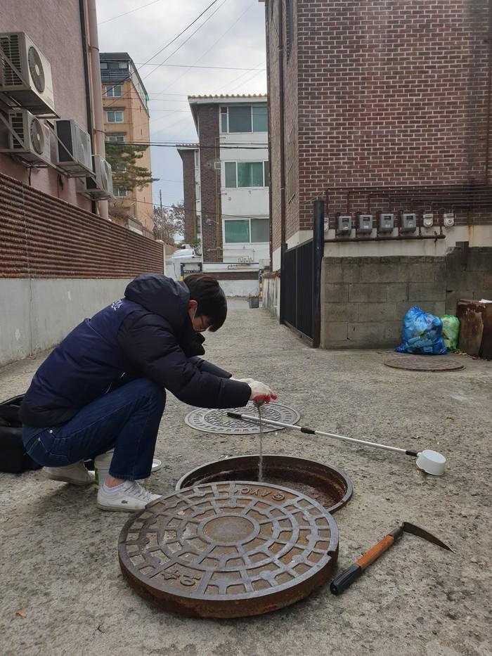 | ▲ 구 관계자가 집수조에 유충 살충제를 살포하고 있다. (사진제공=강서구청) |
