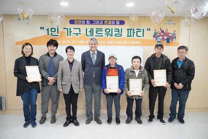 서울 강동구가 지난 7일 이동노동자 지원센터에서 1인 가구 공동체 프로그램 참여자 30여명을 대상으로 ‘1인 가구 네트워킹 파티’를 개최했다. 사진은 감사장·수료증 수여 후 기념촬영을 하고 있는 참가자들의 모습. (사진제공=강동구청)