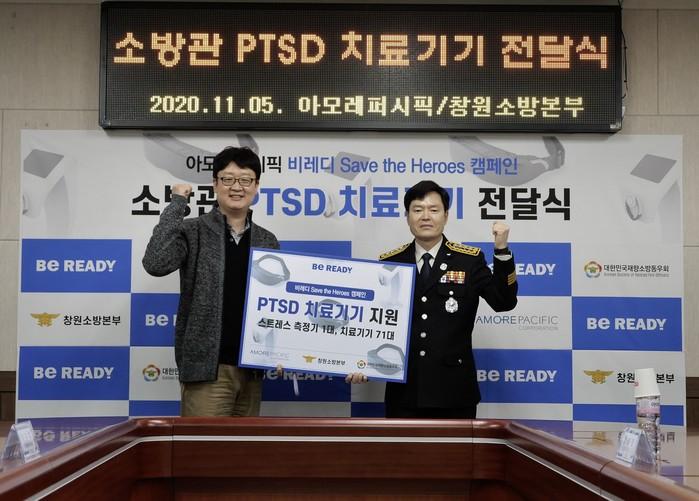 ▲ 최근 열린 소방관 PTSD 치료기기 전달식에서 이영진 아모레퍼시픽 NGI디비전장(왼쪽)과 이기오 창원소방본부장이 기념촬영을 하는 모습. (사진제공=아모레퍼시픽) |
