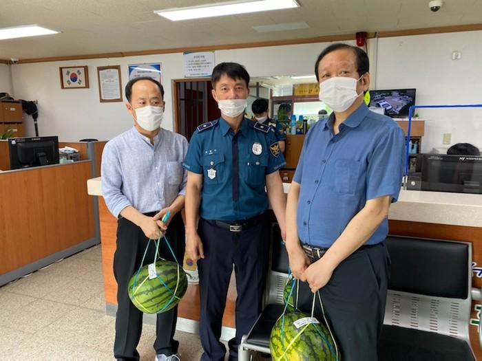 경기 수원시 영통구 영통3동은 30일 지역내 유관기관 및 취약계층을 대상으로 ‘건강한 여름나기 복(伏)수박 전달식’을 개최했다. 사진은 영통3동 주민자치위원회가 영통지구대에 수박을 전달하고 있는 모습. (사진제공=영통구청)