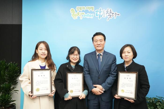 서울 성북구가 최근 구청장실에서 구민들에게 지역의 생생한 정보와 소식을 전달하는 우수 사이버기자단원 3명에게 표창을 수여했다. 사진은 이승로 구청장(오른쪽에서 두 번째)이 우수 사이버 기자들에게 표창을 전달하고 기념촬영을 하는 모습. (사진제공=성북구청)