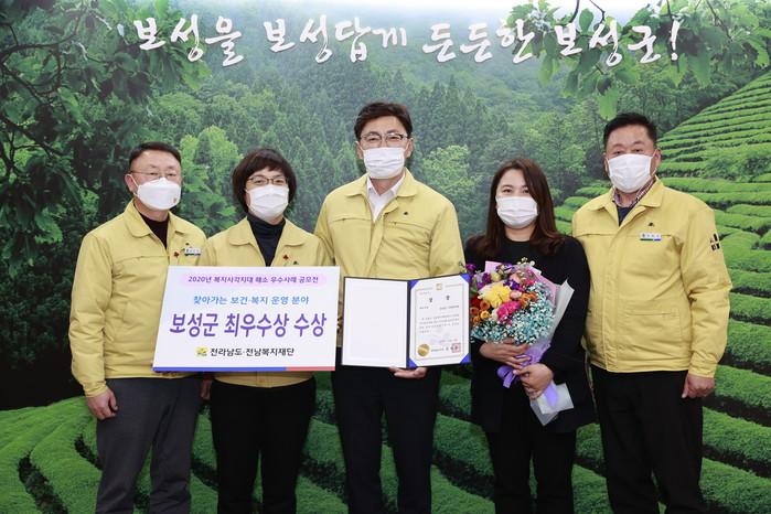 전남 보성군이 최근 전남도와 전남복지재단이 주관하는 복지사각지대 해소 우수사례 공모전에서 찾아가는 보건복지서비스 운영분야 최우수기관으로 선정돼 도지사 기관표창을 받았다. 사진은 군 주민복지과 직원들이 표창을 받은 후 기념촬영을 하는 모습. (사진제공=보성군청)