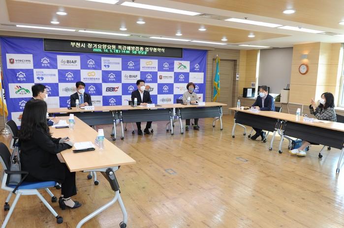 경기 부천시가 5일 부천시의사회, 부천의료복지사회적협동조합과 부천시 장기요양요원 처우 개선을 위해 업무협약(MOU)을 체결했다. 협약에 따라 장기요양요원들의 건강 유지를 위한 무료 독감예방 접종사업이 시행된다. 사진은 장덕천 시장과 관계자들이 협약식을 진행하고 있는 모습. (사진제공=부천시청)