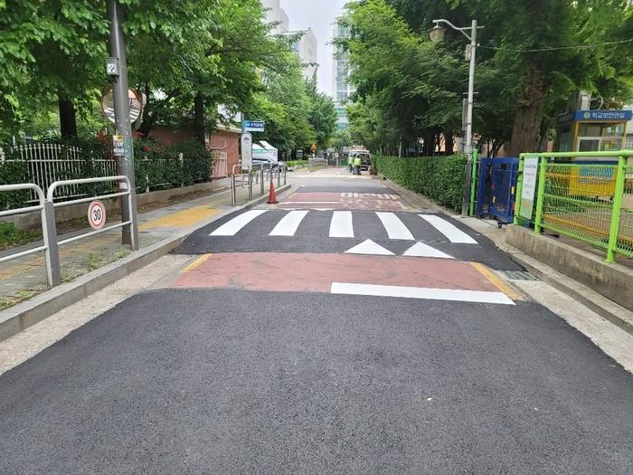| ▲ 경일초등학교 어린이보호구역에 설치된 '고원식 횡단보도'. (사진제공=성동구청) |