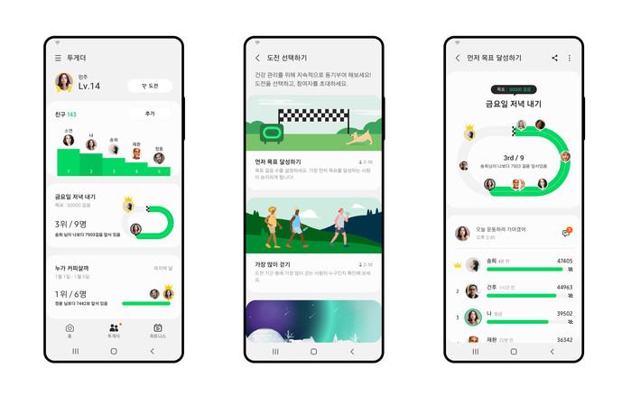 사용자는 삼성 헬스 앱 하단의 투게더 메뉴를 통해 걸음 수 도전을 시작할 수 있으며, 도전 타이틀·도전 기간·목표 걸음 수를 설정해 대결이 가능하다.