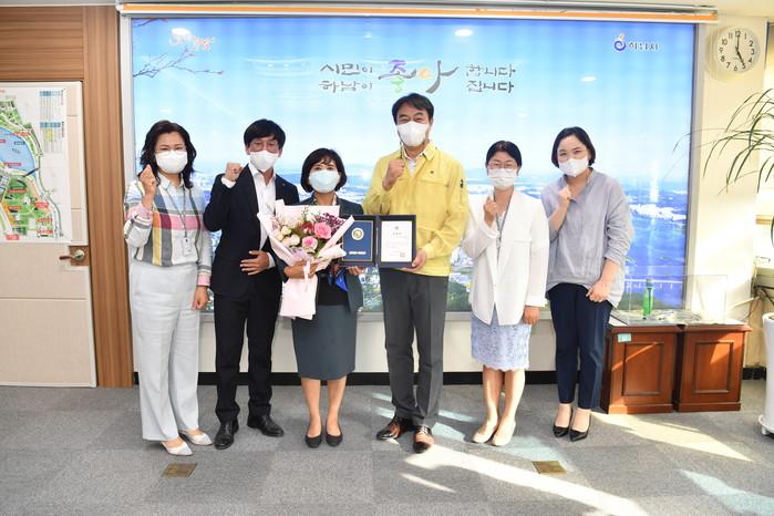 경기 하남시는 2일 하남시육아종합지원센터 강성례 센터장에게 ‘2021 육아종합지원센터 종사자’ 도지사 표창을 전수했다. 이번 표창은 어린이집 등 보육 발전에 기여한 육아종합지원센터 종사자를 격려하고 사기를 진작하기 위해 마련됐다. 사진은 전수식에서 김상호 시장(오른쪽 세 번째)과 수상자 및 관계자들이 기념촬영을 하는 모습. (사진제공=하남시청)
