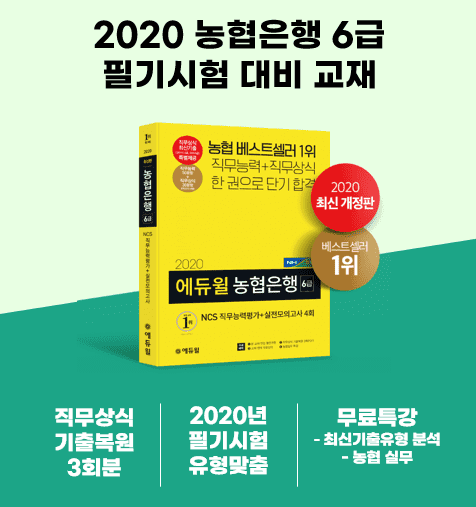 [시민일보 = 여영준 기자] 종합교육기업 에듀윌(대표 박명규)이 출간한 ‘2020 에듀윌 농협은행 6급 NCS 직무능력평가+실전모의고사 4회’ 수험서가 온라인서점 예스24 '농협 NHAT' 부문 1월 4주차 베스트셀러 1위에 올랐다.