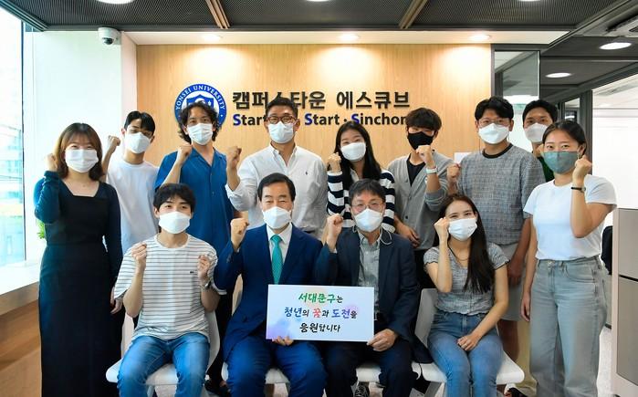 문석진 서울 서대문구청장이 14일 연세대 캠퍼스타운 에스큐브 2호점을 방문해 입주 청년들을 격려했다. 사진은 문 구청장(앞줄 왼쪽 두 번째)이 ‘서대문구는 청년의 꿈과 도전을 응원합니다’란 팻말을 들고 입주 창업팀 청년들과 함께 파이팅을 외치고 있는 모습. (사진제공=서대문구청)