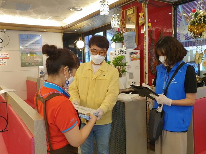 수도권에서 코로나19 확진자가 급증하고 사회적 거리두기가 4단계로 격상됨에 따라 경기 안산시 단원구가 최근 원곡동 다문화거리 일대의 다중이용시설을 대상으로 방역수칙 이행 점검을 위한 ‘현장 점검의 날’을 운영했다. 사진은 이날 참여한 김기서 구청장(가운데)이 음식점에서 방역수칙 안내와 홍보를 하고 있는 모습. (사진제공=단원구청)