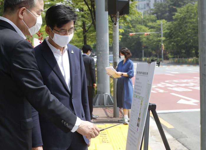 27일 구에 따르면 이번 점검은 지난 3월25일 민식이법(도로교통법과 특정범죄가중처벌법 개정안)이 시행됐지만, 최근 전주에서 만 2세 아이가 스쿨존 내 불법유턴을 하던 SUV 차량과 부딪혀 숨지는 사고가 발생해 경각심을 느낀 박 구청장이 직접 현장 점검을 진행했다.