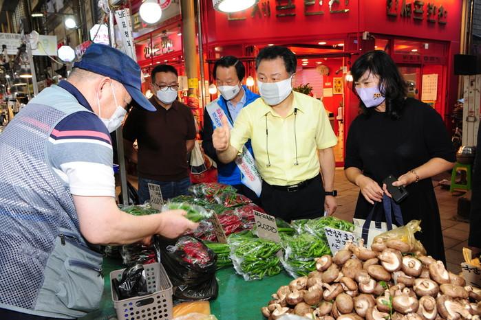안승남 경기 구리시장은 15일 추석 명절을 앞두고 민생 경기 체감을 위한 물가 조사와 코로나19 방역 활동을 위해 구리전통시장을 찾아 송편 등 추석 식료품과 생필품을 구매하고 상인들을 격려했다. 사진은 안 시장(오른쪽 두 번째)이 상인을 격려하고 있는 모습. (사진제공=구리시청)