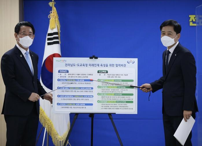 전남도와 전남도교육청이 23일 ‘코로나19 총력대응 및 미래인재 육성을 위한 협력비전’을 공동발표하고, 신학기를 앞둔 도민과 학생이 코로나19로부터 안심할 수 있는 교육환경을 만들기 위해 공동 노력하기로 했다. 사진은 김영록 도지사와 장석웅 도 교육감(오른쪽)이 공동발표문에 대해 설명하고 있는 모습. (사진제공=전남도교육청)