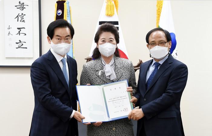 경기 의정부시시설관리공단은 최근 이영애 전 신한대학교 교수를 비상임 사외이사로 선임했다. 이 신임 사외이사는 공단 이사회의 구성원으로서 공단의 주요 경영정책을 심의·의결하는 역할을 수행하게 된다. 사진은 안병용 시장(왼쪽)이 이 신임 사외외사(가운데)에게 임명장을 수여하고 있는 모습. (사진제공=의정부시청)