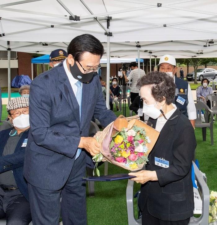 성장현 서울 용산구청장이 최근 열린 ‘호국보훈의 달 기념 보훈가족 나라사랑 행사’에서 김상두씨(상이군경 용산구지회) 등 9명의 모범보훈대상자들에게 표창을 수여했다. 사진은 이날 성 구청장(왼쪽)이 모범보훈대상자에게 표창장을 전달하고 있는 모습. (사진제공=용산구청)