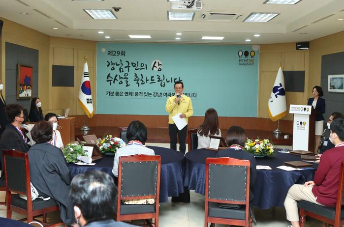 정순균 서울 강남구청장은 21일 ‘제29회 강남구민의 상’ 시상식에 참석해 지역사회 발전과 복지증진을 위해 노력한 단체 및 구민 등 총 20명에게 상패와 메달을 수여했다. 사진은 정 구청장(가운데)이 이날 수상자들에게 축하말을 하고 있는 모습. (사진제공=강남구청)