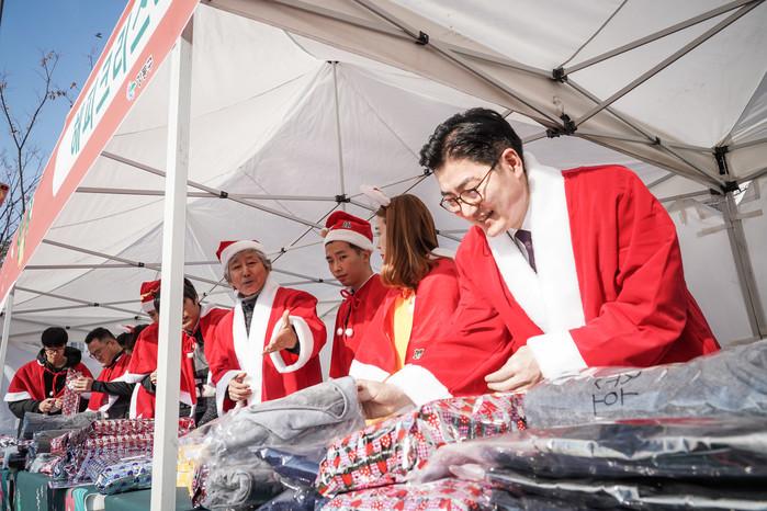 18일 이정훈 서울 강동구청장이 구청 앞 열린뜰에서 열린 ‘2020 희망온돌 따뜻한 겨울나기 모금 생방송’에 참석해 성금을 기부하고, 산타 복장으로 복지시설에 전달할 해피 크리스마스 선물 꾸러미를 정성껏 포장하며 이웃사랑에 동참했다. 사진은 선물 꾸러미를 포장하고 있는 이 구청장(오른쪽)과 참여자들의 모습.(사진제공=강동구청)