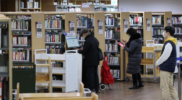 정부의 사회적 거리두기 방역조치 조정에 따라 서울시 산하 도서관·박물관·미술관 등 문화시설 운영이 재개된 19일 서울도서관에서 한 시민이 도서 검색을 하고 있다.