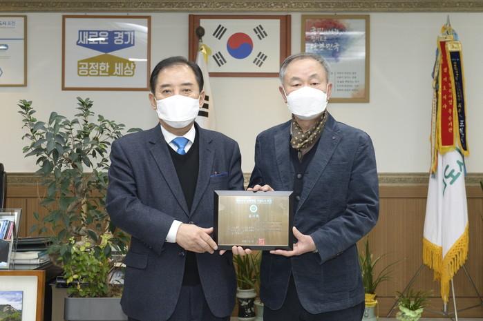 경기 포천시는 23일 한탄강 세계지질공원 센터에 한탄강 주변에서 수집해온 구석기 격지, 철제 화살촉, 어망추 등 유물 19점을 기증한 한귀덕씨에게 감사패를 전달했다. 사진은 전달식에서 박윤국 시장(왼쪽)과 한씨가 기념촬영을 하는 모습. (사진제공=포천시청)