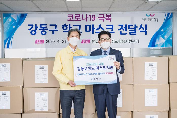 21일 서울 강동구가 자기주도학습지원센터(명일동)에서 양희두 강동송파교육지원청 교육장이 참석한 가운데, 유치원 및 초·중·고등학교 학생과 교직원을 위한 ‘마스크 전달식’을 개최했다. 사진은 이정훈 구청장(오른쪽)이 마스크를 전달한 후 기념촬영을 하고 있는 모습. (사진제공=강동구청)